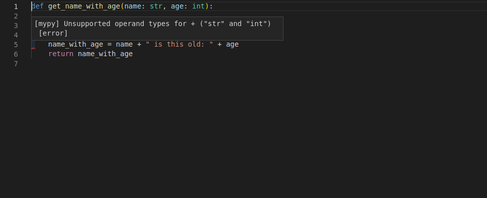 편집기가 변수의 타입을 알고 있기 때문에, 자동완성 뿐 아니라 에러도 확인할 수 있습니다: