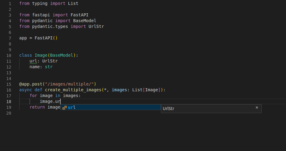예를 들어 Image 모델 안에 url 필드를 str 대신 Pydantic의 HttpUrl로 선언할 수 있습니다: