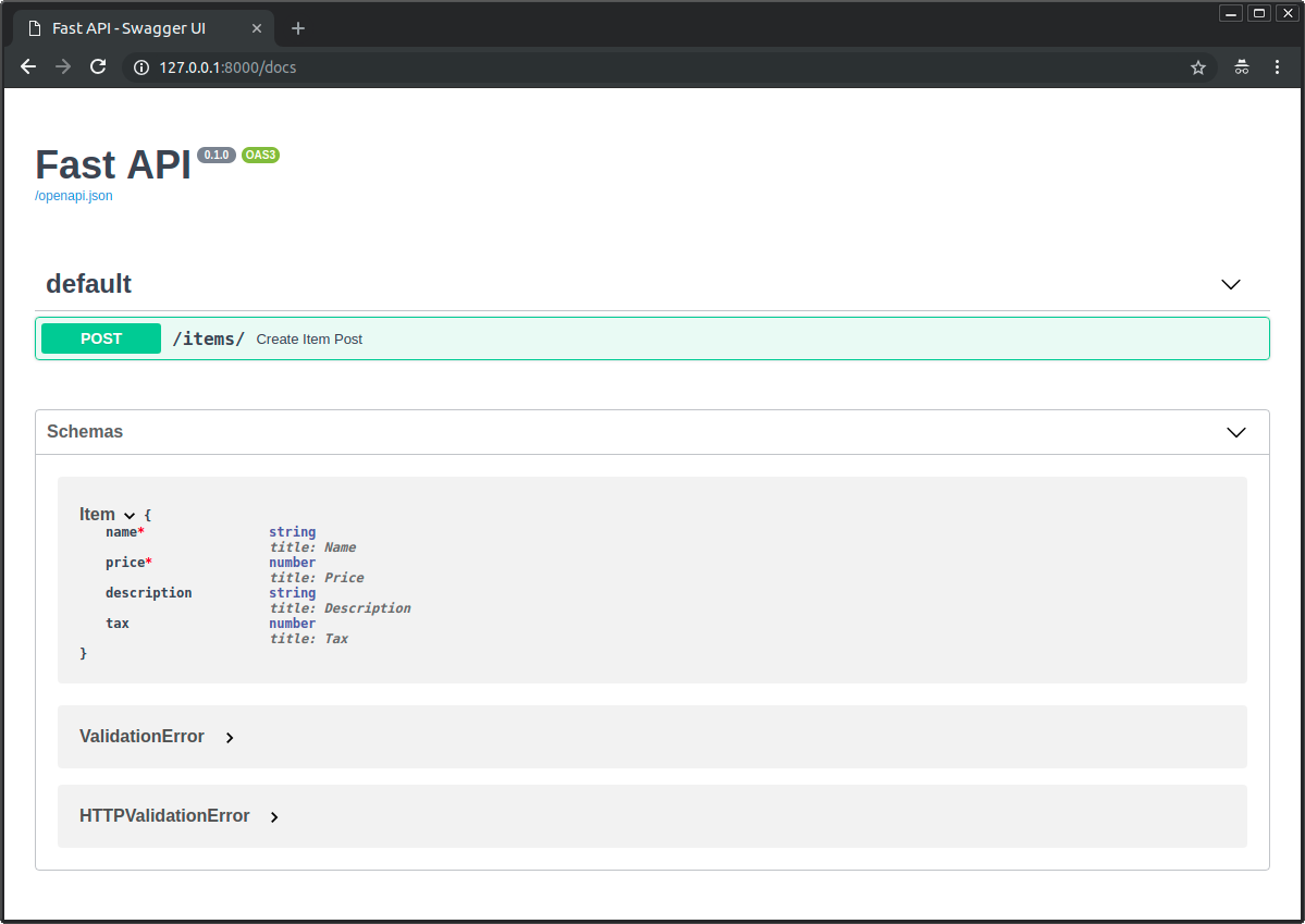모델의 JSON 스키마는 생성된 OpenAPI 스키마에 포함되며 대화형 API 문서에 표시됩니다: