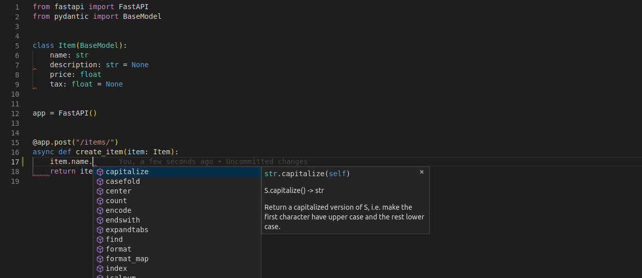 편집기에서, 함수 내에서 타입 힌트와 완성을 어디서나 (만약 Pydantic model 대신에 dict을 받을 경우 나타나지 않을 수 있습니다) 받을 수 있습니다: